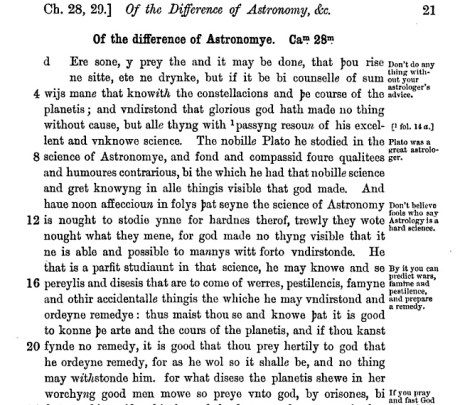 Nowe to oure first mater and purpose, it is to wite, In the ordinaunce of the sterres; In disposicioun of ϸe signes and alyenyng and mevyng fro ϸe sonne; and this party is called Astronomye; that other part is of qualitees, and also for to knowe the mevyng of ϸe firmament, and the dgrees of ϸe risyng of ϸe signes that are vndir the firmament of ϸe mone, and this is the most worthi part of Astronomye, for ϸerin is the cheef knowyng of ϸat science. (Cap. 28 ll. 26-34)[9]